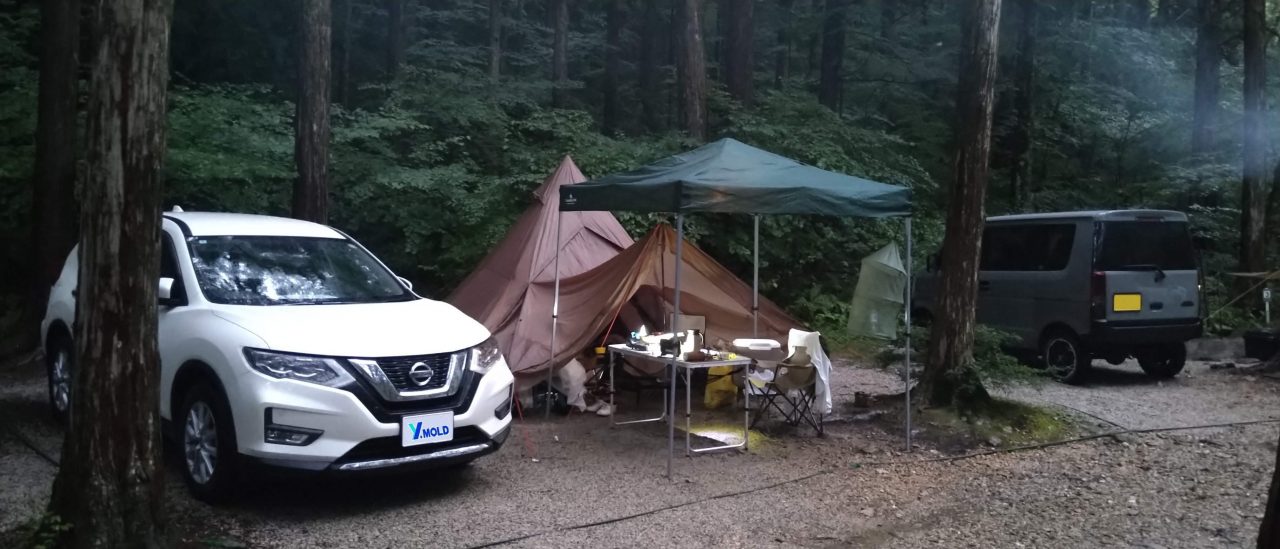 妻籠宿では小雨だったのに、キャンプ場に着くころには本降りの雨になってました…