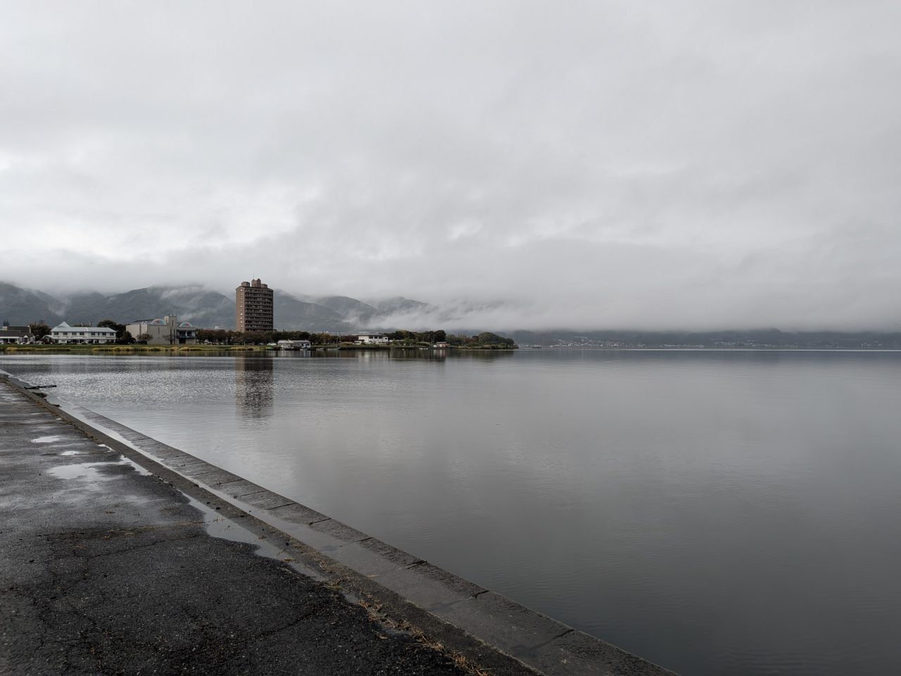 もやがかった諏訪湖の景色もちょっと幻想的で、気持ち良いロケーションでした。