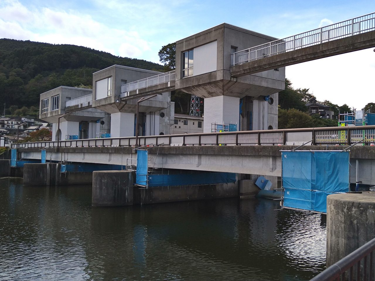 14km地点くらいが「釜口水門」です。ここから流れる天竜川は、